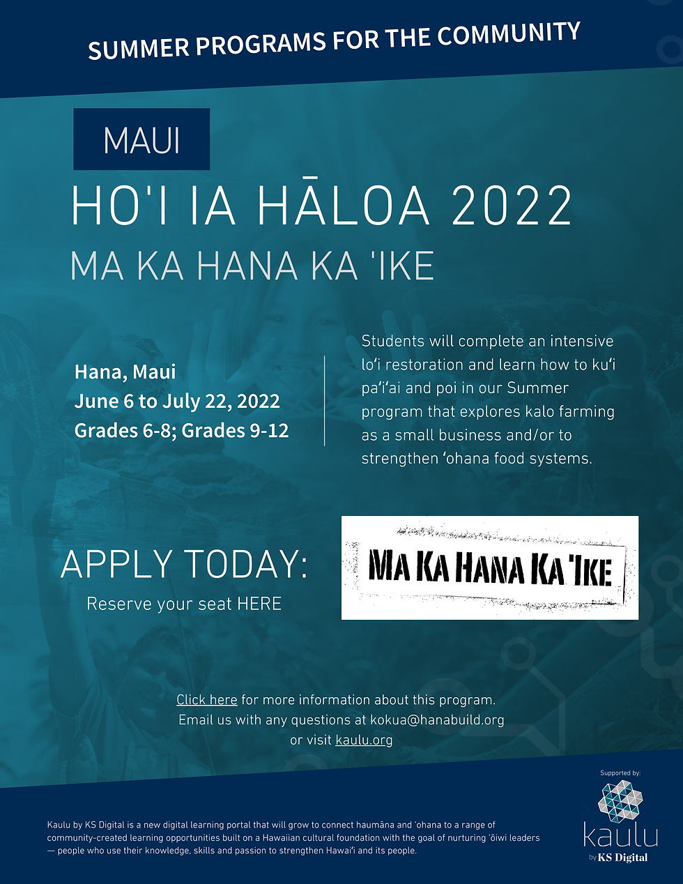 Students will complete an intensive loʻi restoration and learn how to kuʻi paʻiʻai and poi in our Summer program that explores kalo farming as a small business and/or to strengthen ʻohana food systems.