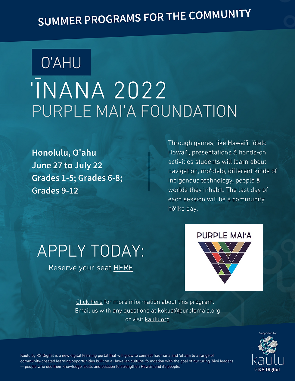Through games, ‘ike Hawaiʻi, ‘ōlelo Hawaiʻi, presentations & hands-on activities students will learn about navigation, moʻolelo, different kinds of Indigenous technology, people & worlds they inhabit. The last day of each session will be a community hōʻike day.